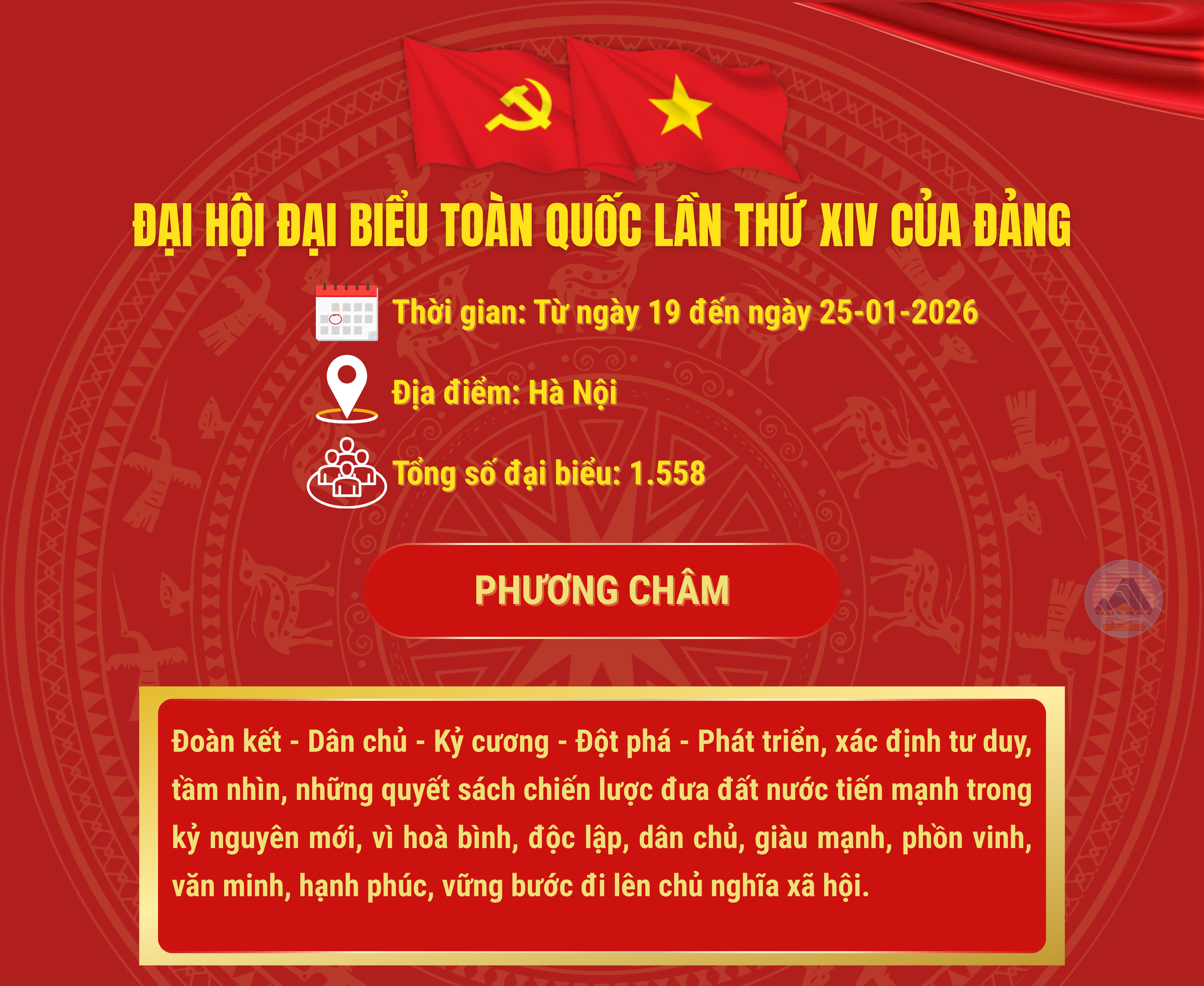 Đại hội đại biểu toàn quốc lần thứ XIV của Đảng với phương châm "Đoàn kết - Dân chủ - Kỷ cương - Đột phá- Phát triển, xác định tư duy, tầm nhìn, những quyết sách chiến lược đưa đất nước tiến mạnh trong kỷ nguyên mới, vì hoà bình, độc lập, dân chủ, giàu mạnh, phồn vinh, văn minh, hạnh phúc, vững bước đi lên chủ nghĩa xã hội".