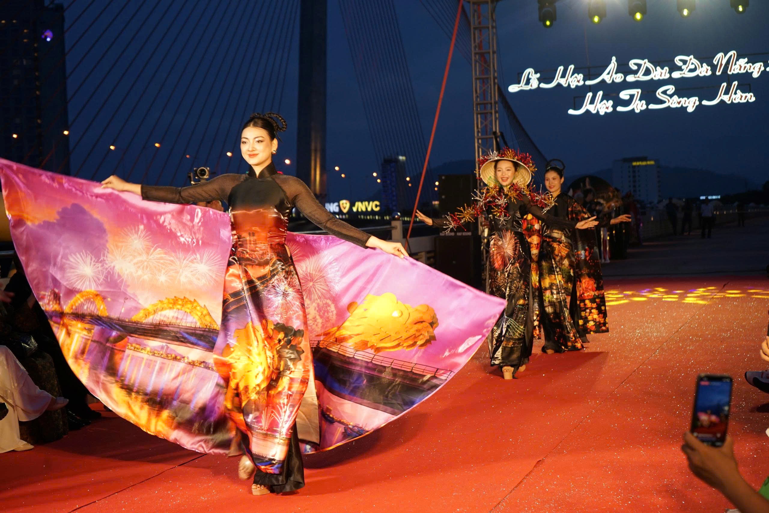 Những địa danh nổi tiếng của Đà Nẵng được chuyển tải tinh tế qua tà áo dài.
