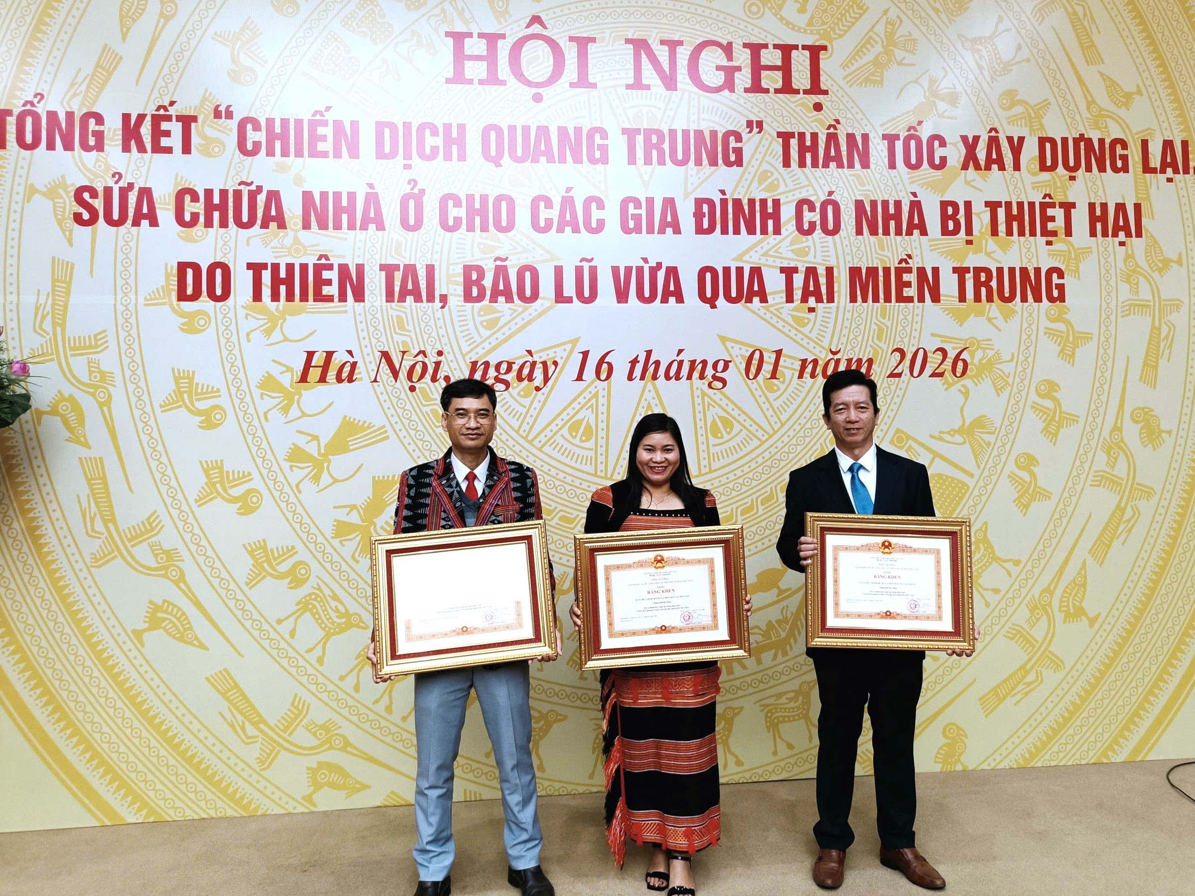 Sáng 16-01, tại Hà Nội, 03 địa phương gồm: xã Trà Linh, xã Nam Trà My và xã Avương vinh dự được Thủ tướng Chính phủ tặng Bằng khen tại Hội nghị tổng kết “Chiến dịch Quang Trung” thần tốc xây dựng, sửa chữa nhà ở cho các hộ dân bị thiệt hại do bão, lũ vừa qua.
