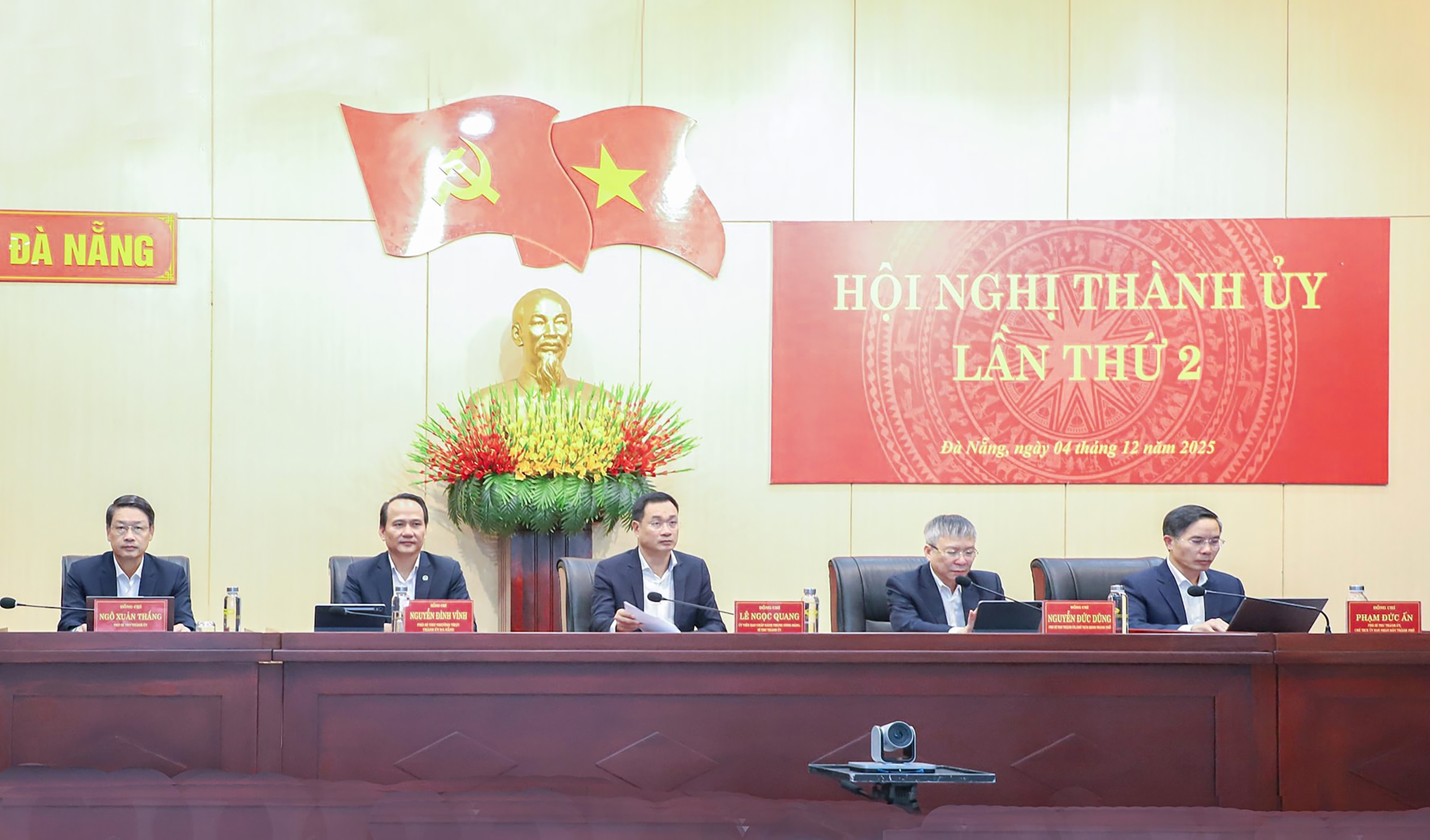 Bí thư Thành ủy Lê Ngọc Quang; Phó Bí thư Thường trực Thành ủy Nguyễn Đình Vĩnh; Phó Bí thư Thành ủy, Chủ tịch HĐND thành phố Nguyễn Đức Dũng; Phó Bí thư Thành ủy, Chủ tịch UBND thành phố Phạm Đức Ấn và Phó Bí thư Thành ủy Ngô Xuân Thắng đồng chủ trì hội nghị.