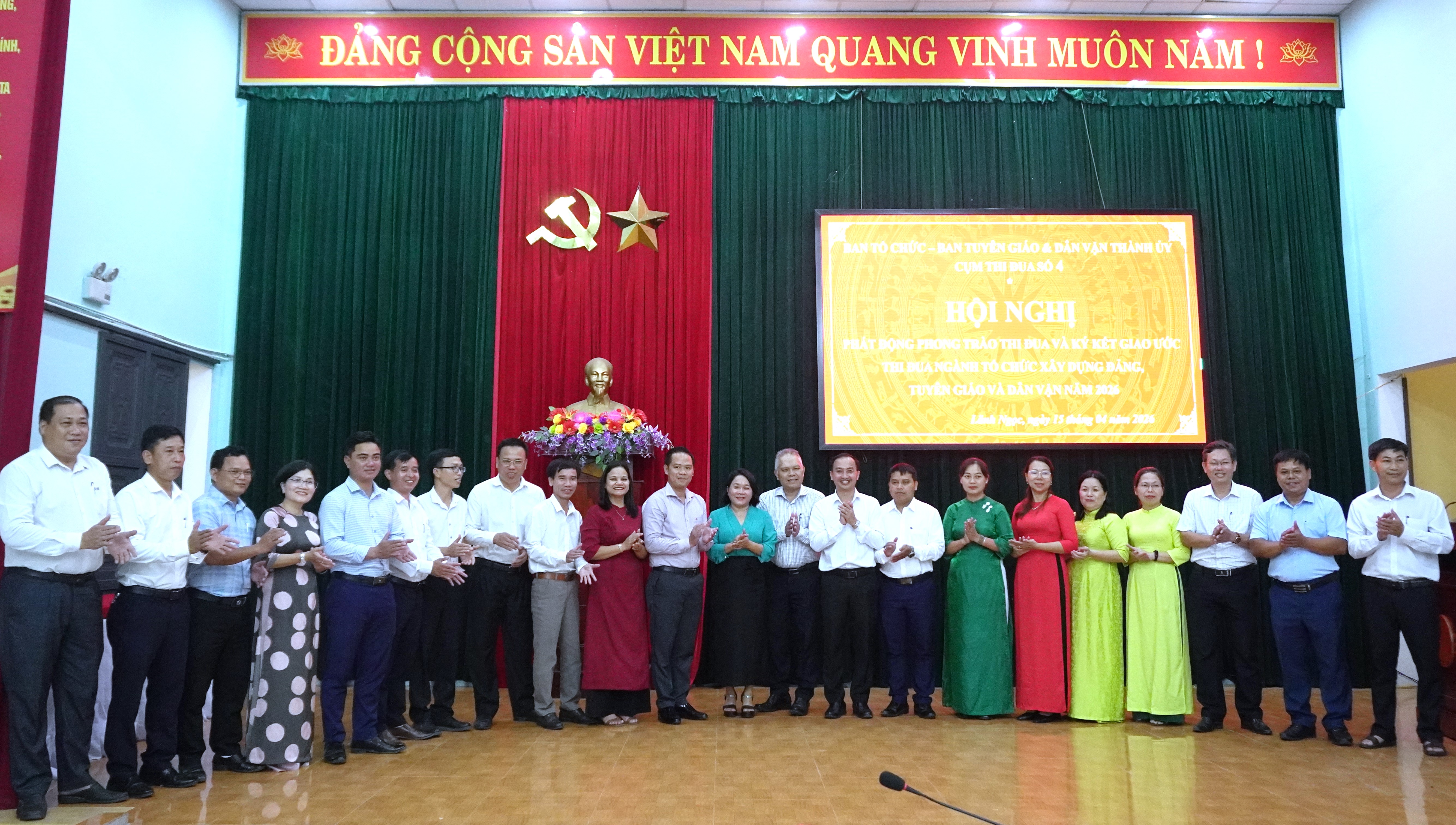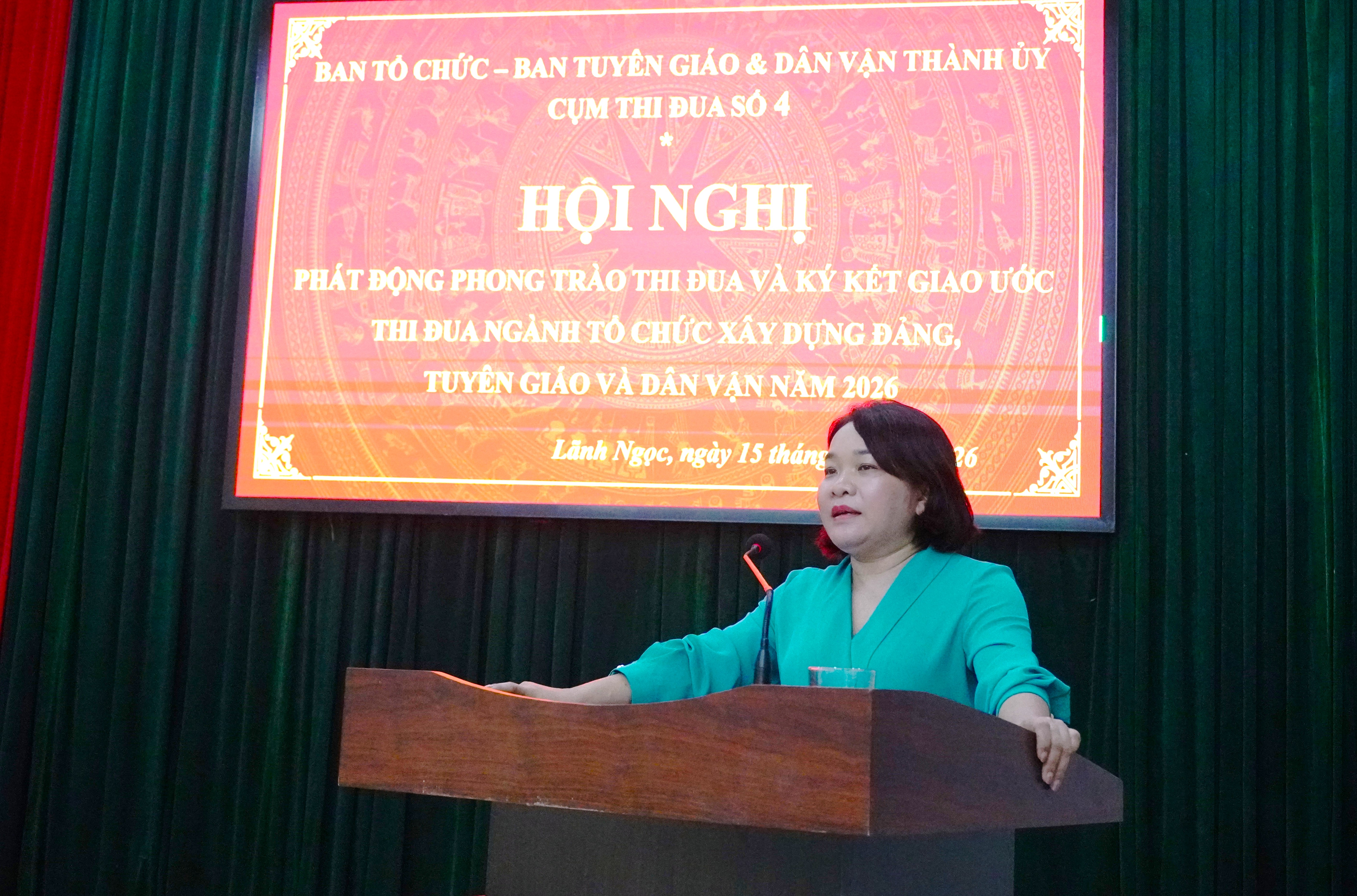 Chiều 15-4, tại xã Lãnh Ngọc, Cụm thi đua số 04 tổ chức hội nghị ký kết giao ước thi đua hoạt động tuyên giáo và dân vận năm 2026. Dự hội nghị có Trưởng Ban Tuyên giáo và Dân vận Thành ủy Huỳnh Thị Thùy Dung; Thường trực Đảng ủy, lãnh đạo Ban Xây dựng Đảng của 12 xã trong cụm.