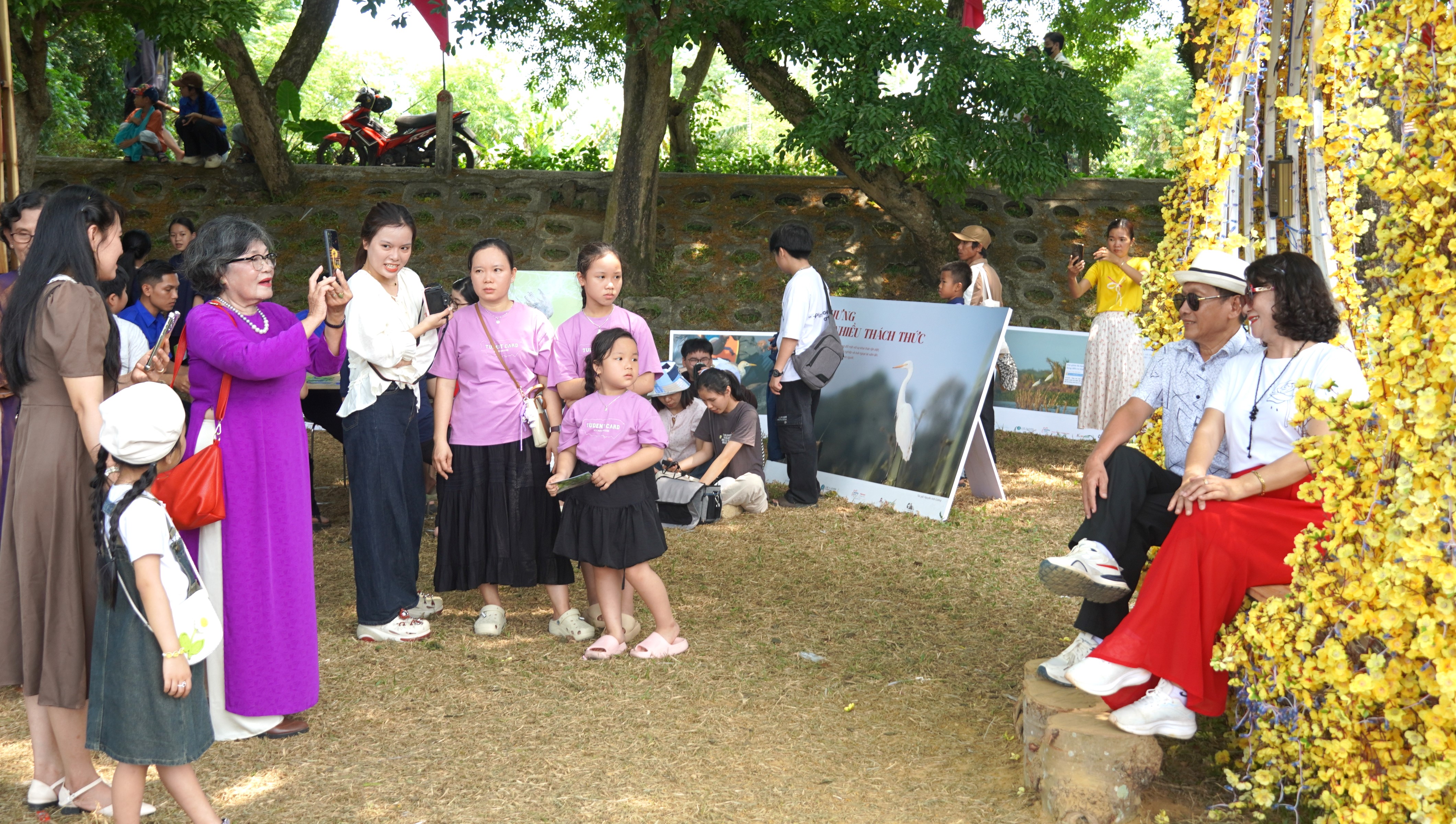 Từ sáng sớm, các tuyến đường dẫn vào làng sinh thái Hương Trà đã đông đúc người qua lại. Nhiều gia đình, nhóm bạn trẻ tranh thủ ghi lại những khoảnh khắc dưới tán hoa sưa vàng rực. Các khu check-in, không gian văn hóa và ẩm thực luôn nhộn nhịp hòa cùng âm nhạc góp phần tạo nên bức tranh lễ hội đầy sức sống, vừa náo nhiệt, vừa thơ mộng.