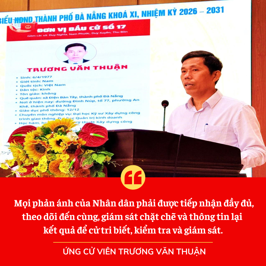 Sinh ra và lớn lên bên dòng sông Thu Bồn, trải qua hơn 25 năm công tác trên nhiều lĩnh vực, đặc biệt là tham mưu quản lý nhà nước về đầu tư, đô thị, giải tỏa đền bù và công tác dân nguyện, ứng cử viên Trương Văn Thuận nhận thức sâu sắc rằng phát triển bền vững phải bắt đầu từ việc lắng nghe Nhân dân, hiểu Nhân dân và giải quyết kịp thời những nguyện vọng chính đáng của người dân.