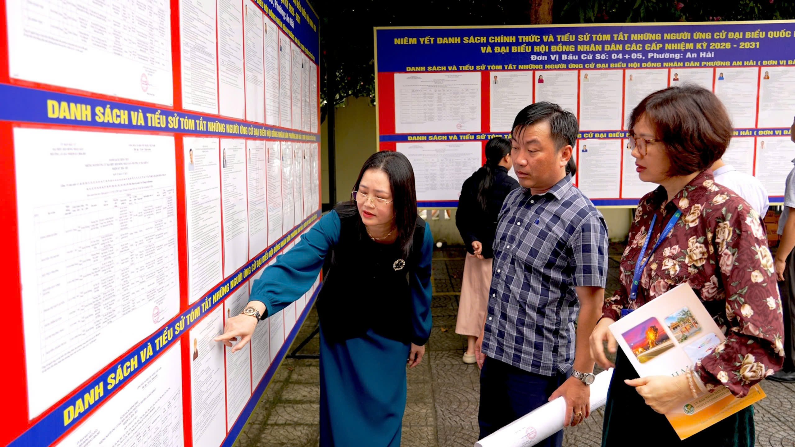 Lãnh đạo phường An Hải kiểm tra danh sách và tiểu sử những người ứng cử được niêm yết tại khu vực bỏ phiếu