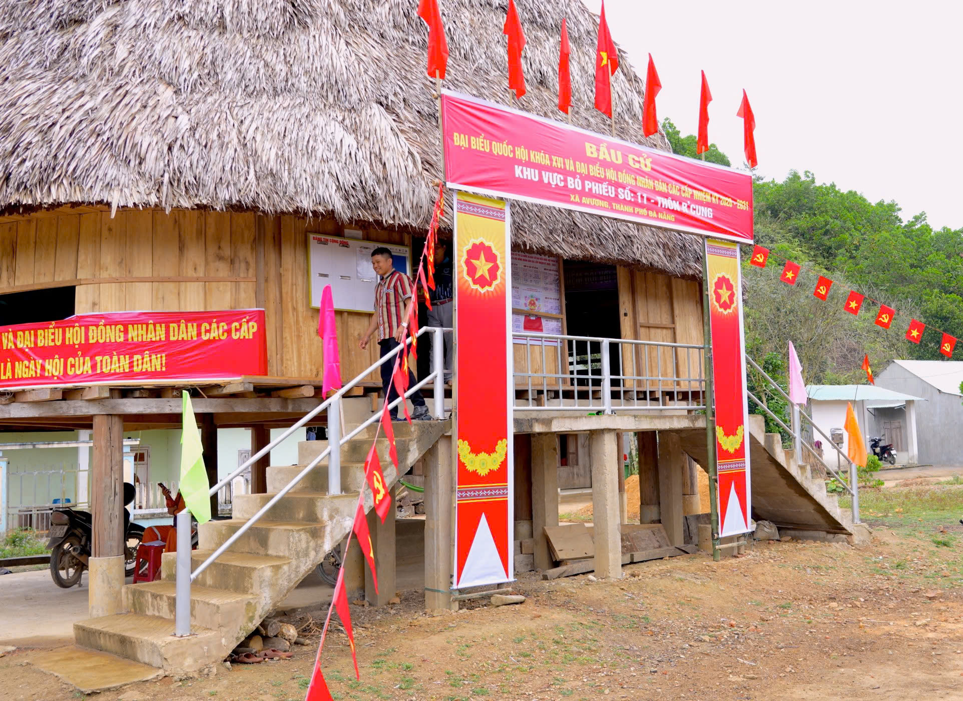 Khu vực bỏ phiếu số 11 tại thôn R'Cung, xã A Vương được trang trí cờ, băng rôn, khẩu hiệu chào mừng cuộc bầu cử đại biểu Quốc hội khóa XVI và đại biểu HĐND các cấp nhiệm kỳ 2026–2031