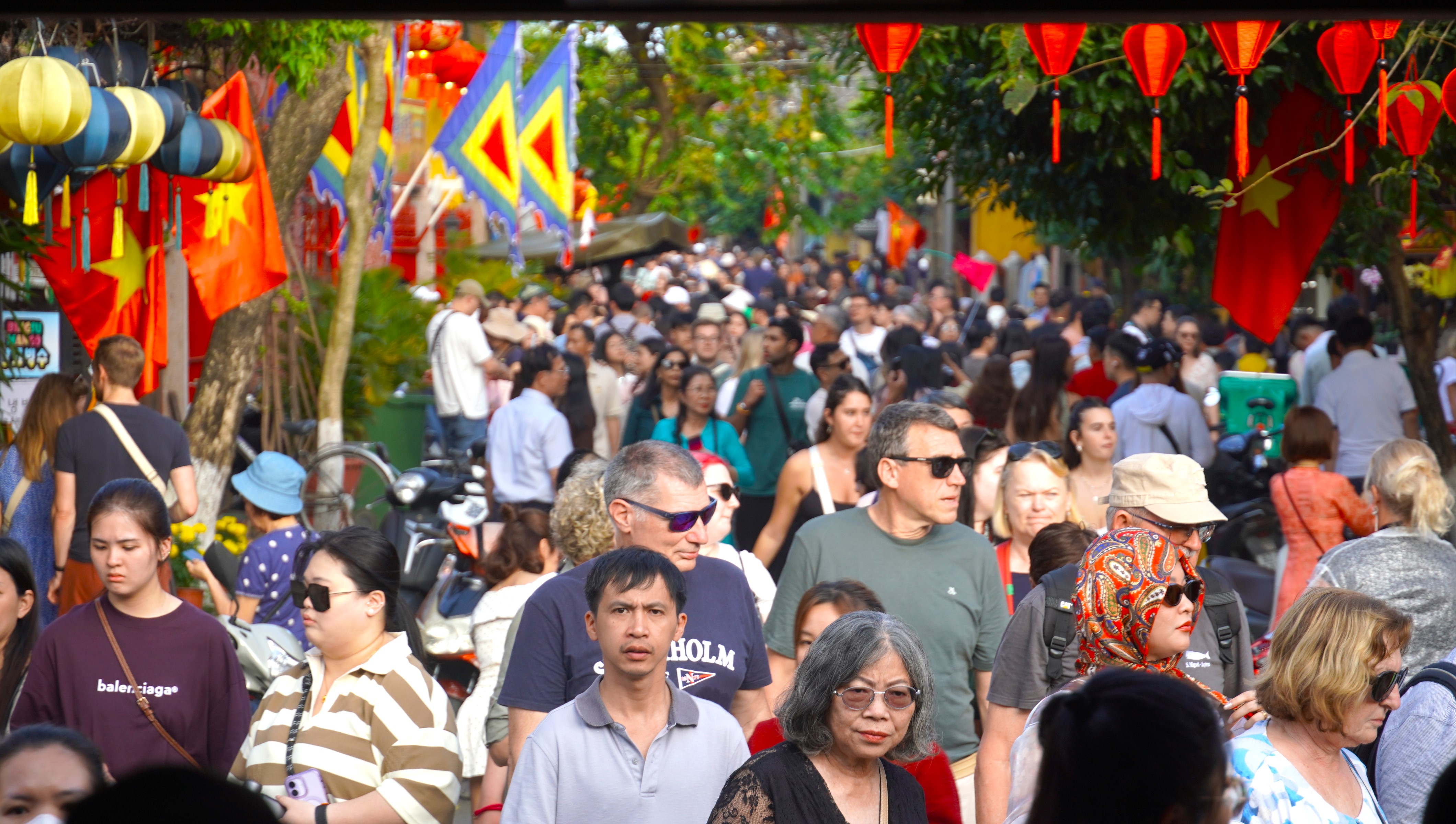 Dịp đầu năm mới, phố cổ Hội An đón lượng lớn khách đến tham quan. Các tuyến đường trung tâm như Trần Phú, Nguyễn Thái Học, Bạch Đằng nhộn nhịp người qua lại, nhiều thời điểm rơi vào tình trạng đông kín.