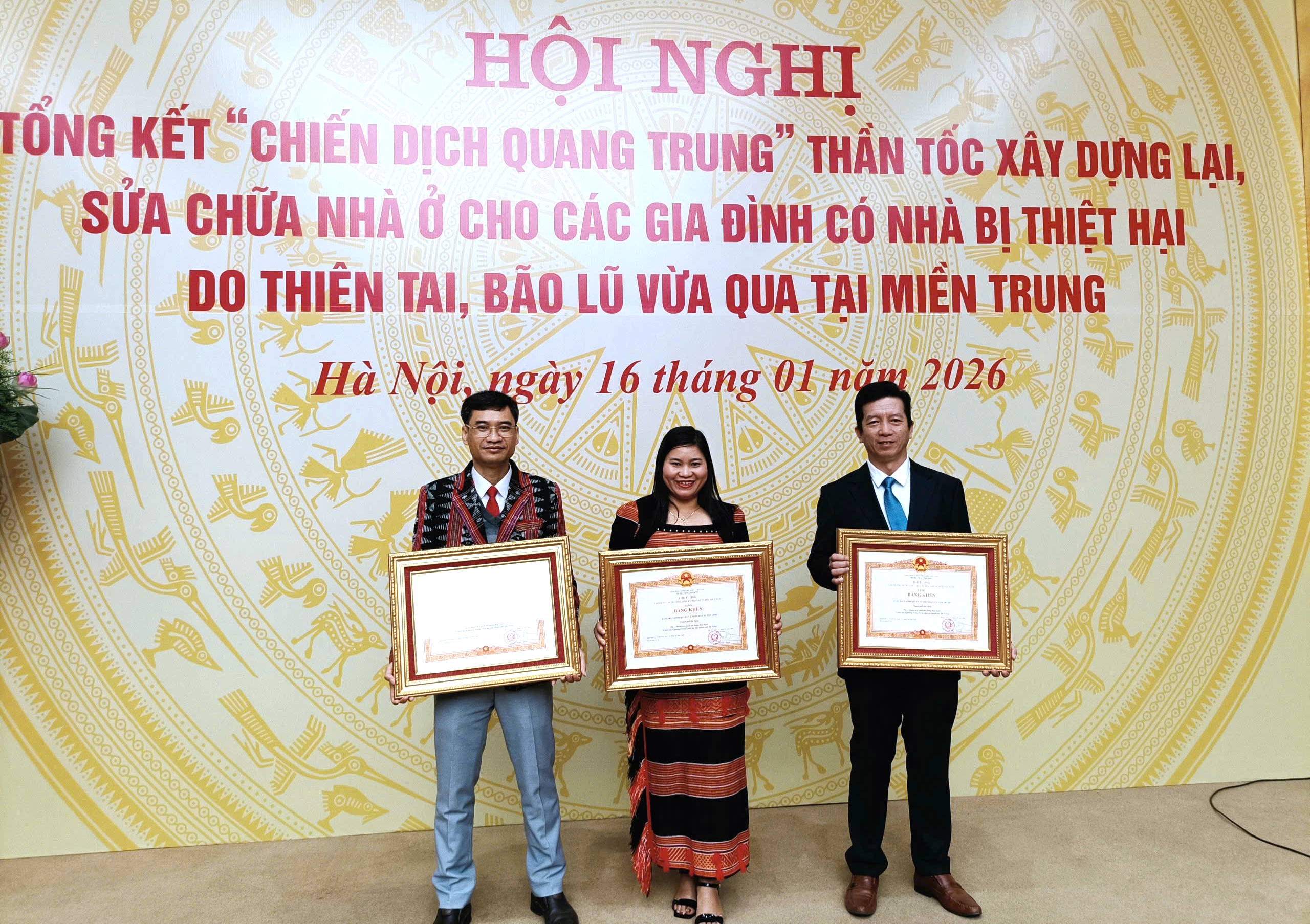 Sáng 16-01, tại Hà Nội, 03 địa phương gồm: xã Trà Linh, xã Nam Trà My và xã Avương vinh dự được Thủ tướng Chính phủ tặng Bằng khen tại Hội nghị tổng kết “Chiến dịch Quang Trung” thần tốc xây dựng, sửa chữa nhà ở cho các hộ dân bị thiệt hại do bão, lũ vừa qua.